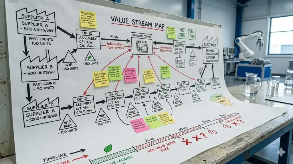 Value Stream Mapping (VSM) makes that invisible system visible. It is one of the most powerful tools in lean manufacturing, and one of the most underused, not because it is complex, but because it requires going to the floor, observing honestly, and accepting that reality is probably very different from the procedure manual.